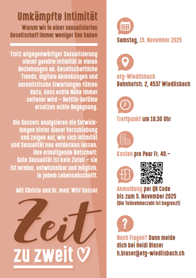 Geniesst gemeinsam einen entspannten, inspirierenden Abend. Beim Apero dürft ihr eure Zeit zu zweit geniessen und anderen Paaren begegnen. Ein spannender Input von Christa und Wilf Gasser wird eure Beziehung bereichern. Ein feines Dessert rundet den Abend ab.