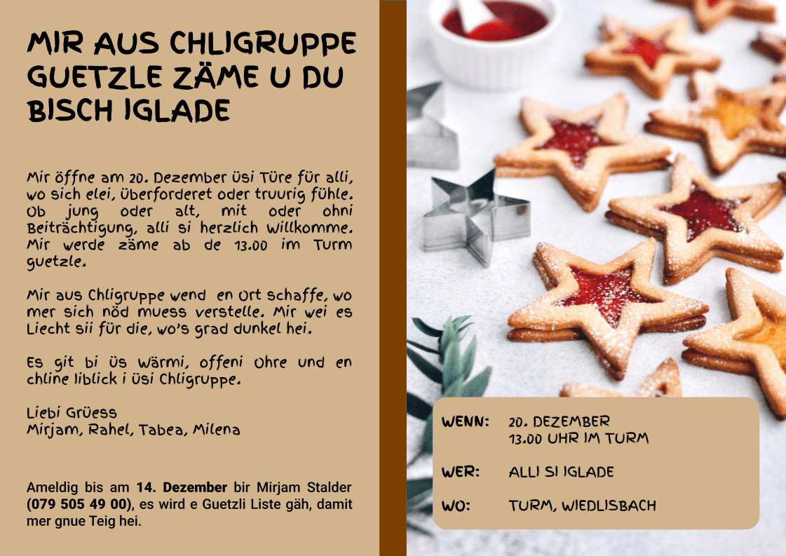 Mir öffne am 20. Dezember üsi Türe für alli, wo sich elei, überforderet oder truurig fühle. Ob jung oder alt, mit oder ohni Beiträchtigung, alli si herzlich Willkomme. Mir werde zäme ab de 13.00 im Turm guetzle.